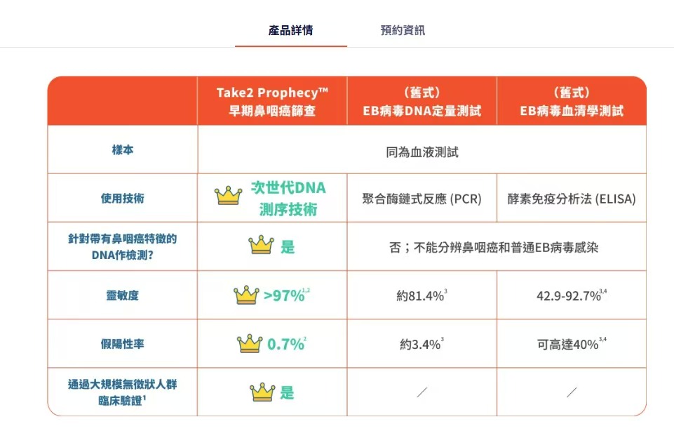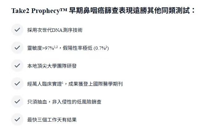 Take2 Prophecy™ 是一項無創早期鼻咽癌篩查,採用次世代DNA測序技術 (NGS: Next-generation Sequencing),專門捕捉血液中的鼻咽癌DNA訊號,即可有效識別出未有明顯病徵的早期患者,提高其成功治療的可能性及存活率;其靈敏度更高於97%¹,²,冠絕市場上同類測試!