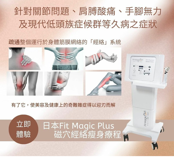 Fit Magic Plus 由日本YAMAN公司製造,以超低頻電流配合獨特手法,疏通經絡及淋巴,即時排毒袪水腫,加強燃燒脂肪,同時促進微循環,增強新陳代謝,微電流軟化僵硬筋肌,通淋巴去掉多餘水腫和老化廢物。